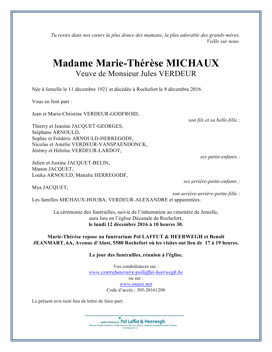 Décédée à Rochefort (5580) le jeudi 8 décembre 2016 à l'âge de 94 ans