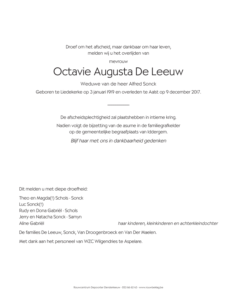 Fallecida en Aalst (9300) el sábado, 9 de diciembre de 2017 a la edad de 98 años