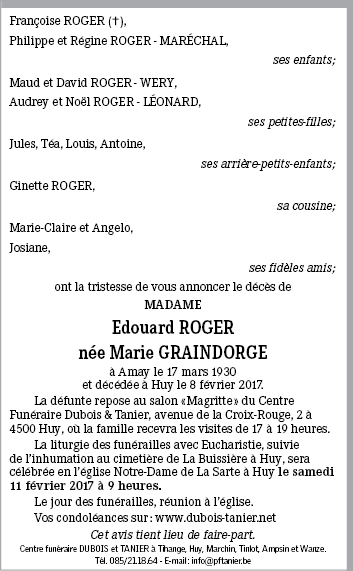 Overleden te Huy (4500) op woensdag 8 februari 2017 op 86-jarige leeftijd