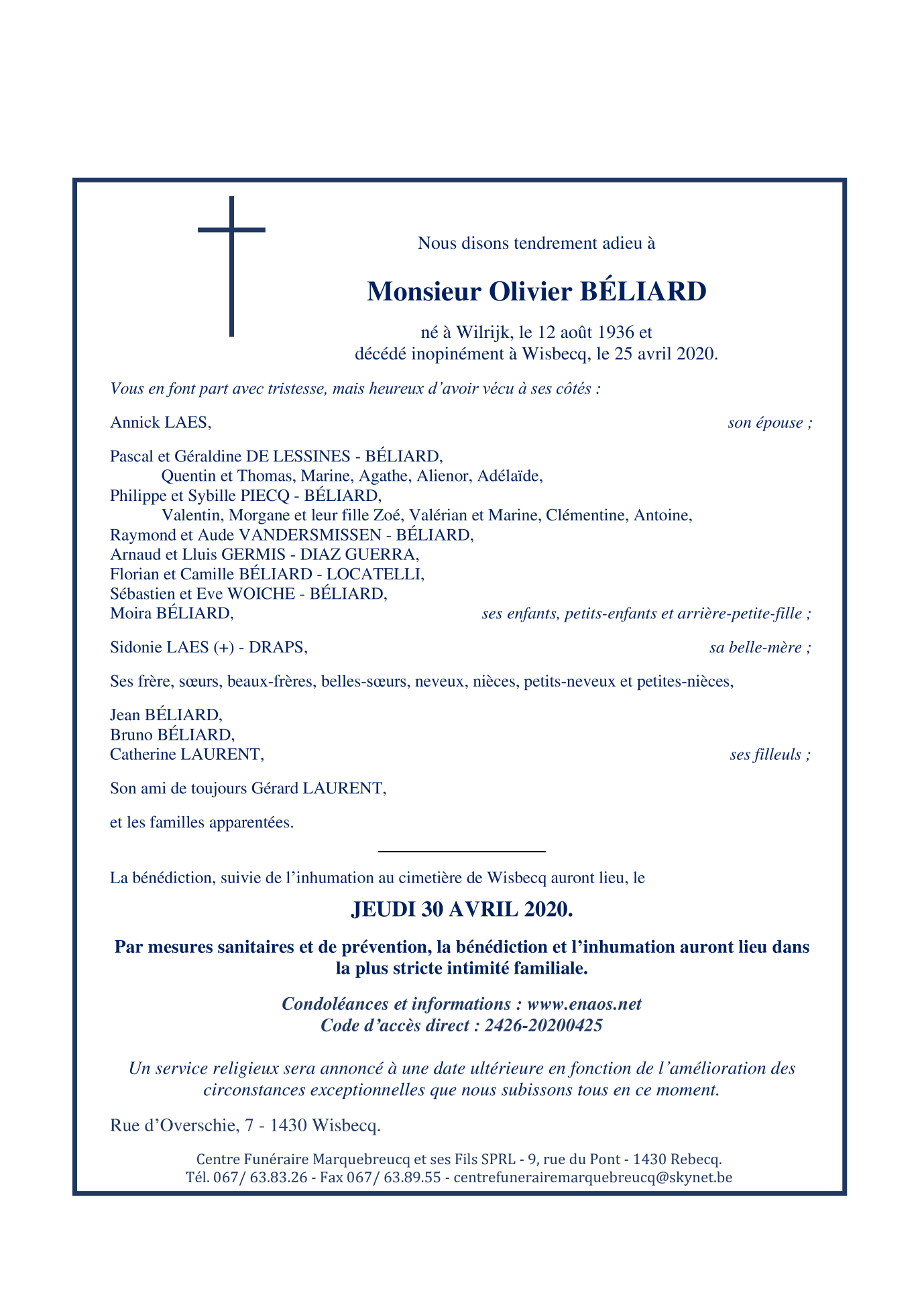 Décédé à Wisbecq (1430) le samedi 25 avril 2020 à l'âge de 83 ans