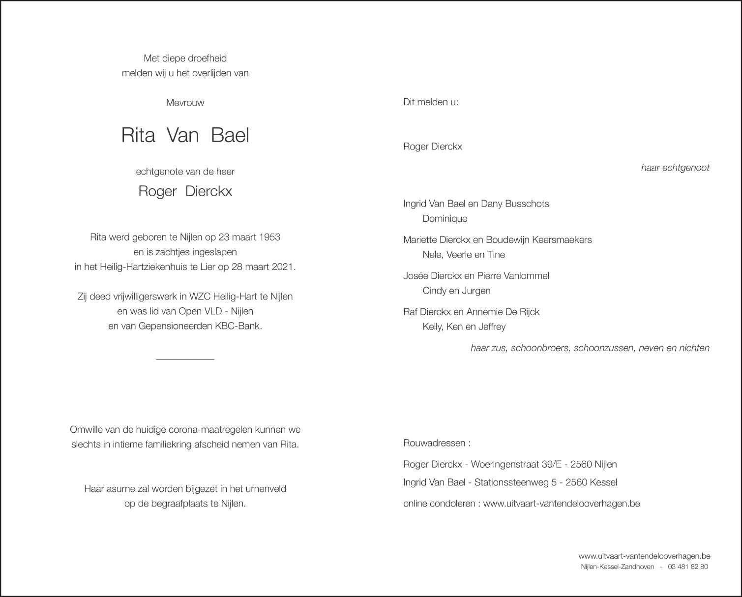 Décédée à Lier (2500) le dimanche 28 mars 2021 à l'âge de 68 ans