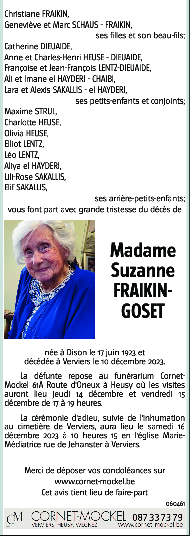 Fallecida en Verviers (4800) el lunes, 11 de diciembre de 2023 a la edad de 100 años