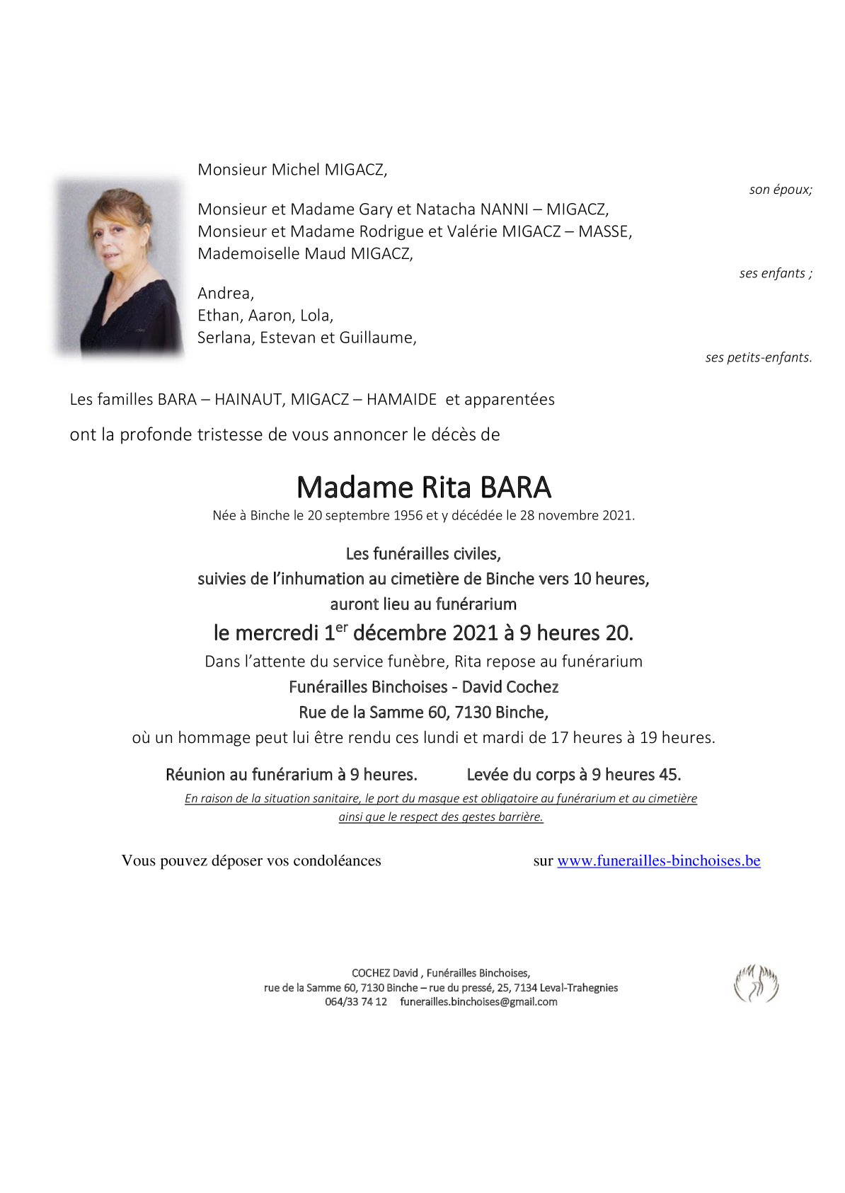 Décédée à Binche (7130) le dimanche 28 novembre 2021 à l'âge de 65 ans