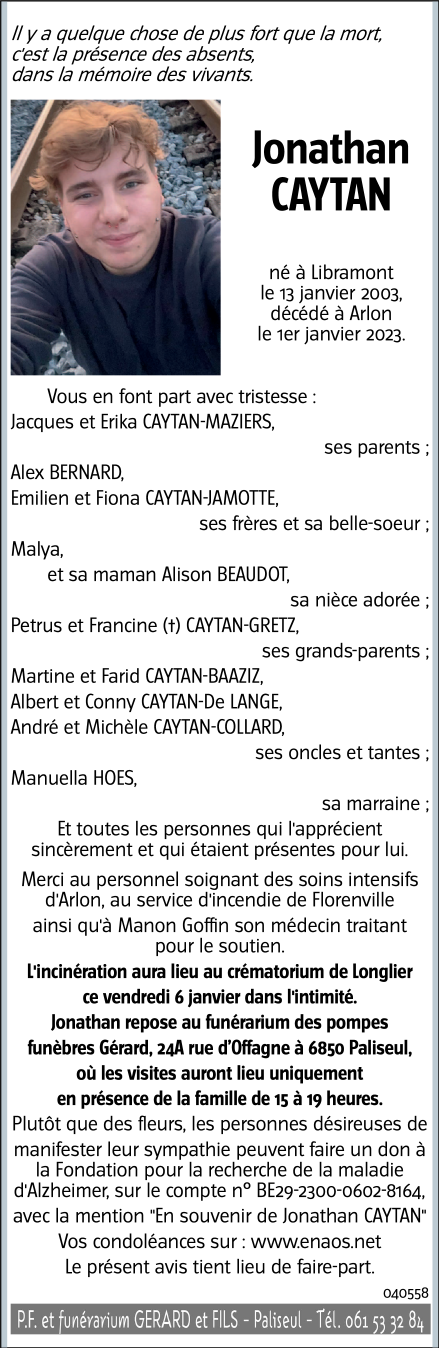 Died in Arlon (6700) on 02 January 2023 at the age of 19 years