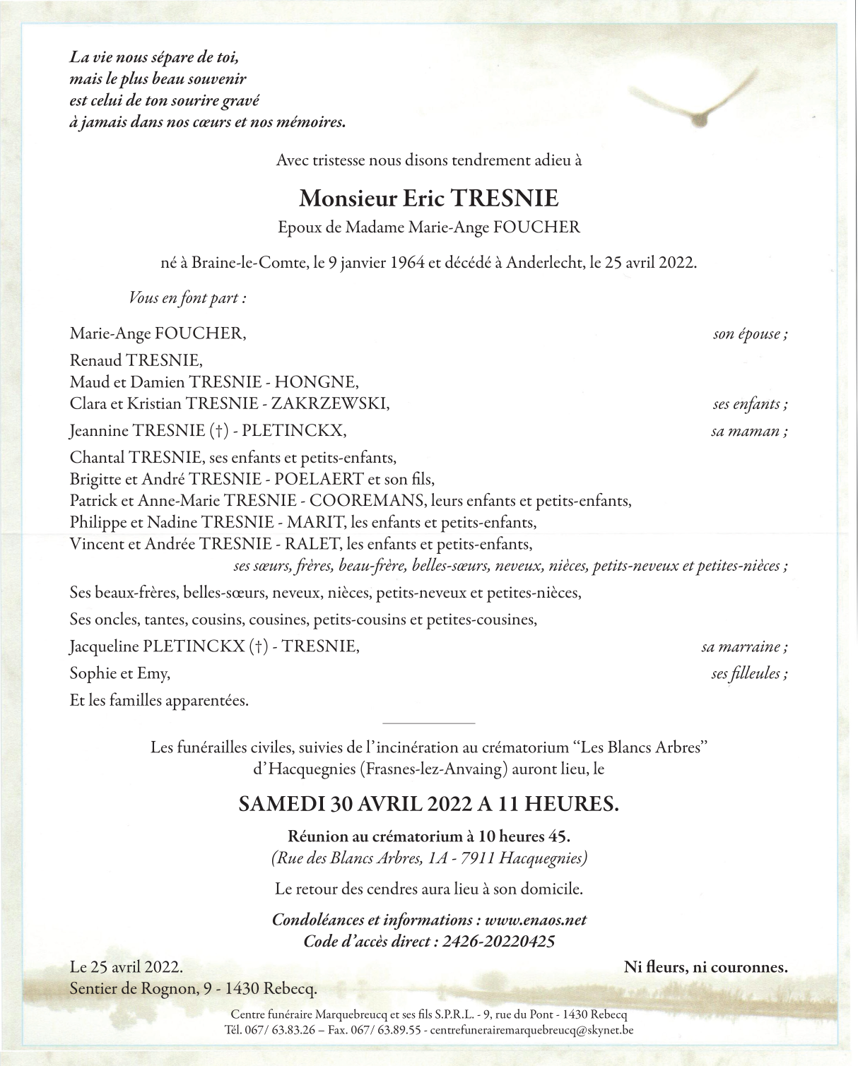 Décédé à Anderlecht (1070) le lundi 25 avril 2022 à l'âge de 58 ans