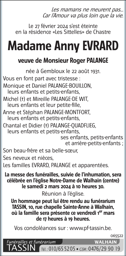 Décédée à Chastre (1450) le mardi 27 février 2024 à l'âge de 92 ans