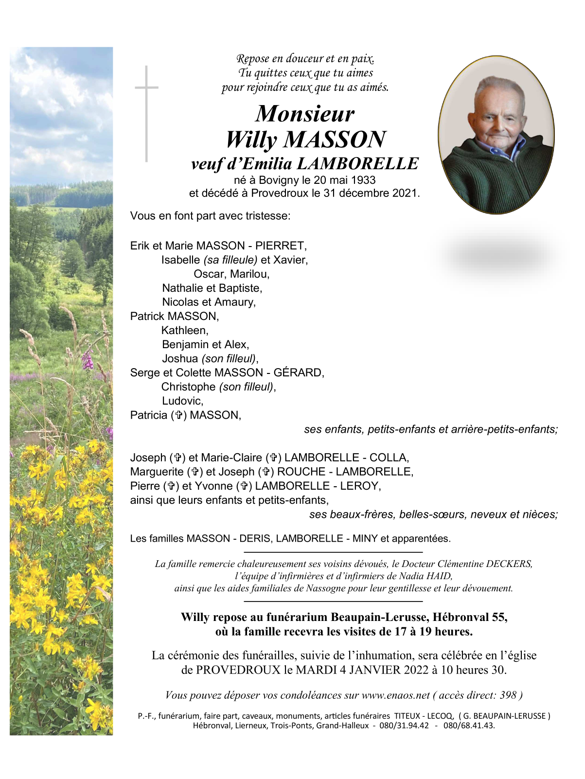 Décédé à Provedroux (6690) le vendredi 31 décembre 2021 à l'âge de 88 ans