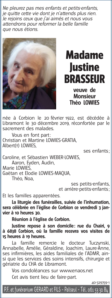 Fallecida en Libramont (6800) el lunes, 30 de diciembre de 2019 a la edad de 97 años