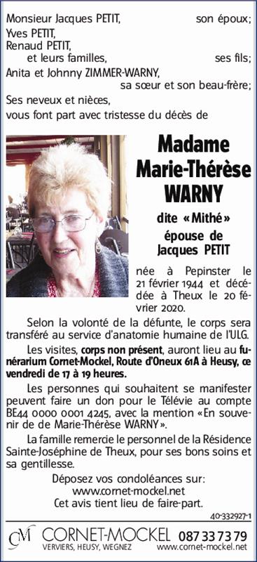 Décédée à Theux (4910) le jeudi 20 février 2020 à l'âge de 75 ans