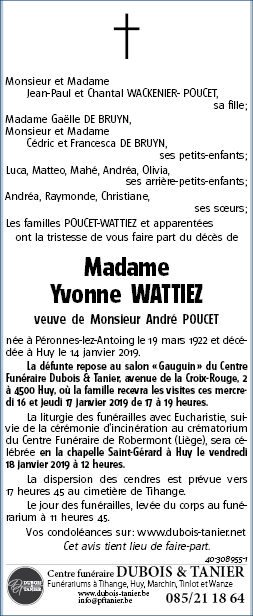 Overleden te Huy (4500) op maandag 14 januari 2019 op 96-jarige leeftijd