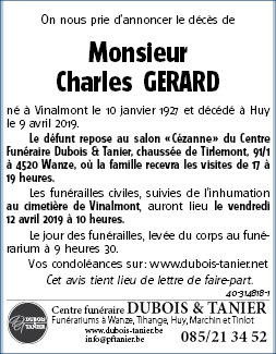 Overleden te Huy (4500) op dinsdag 9 april 2019 op 92-jarige leeftijd