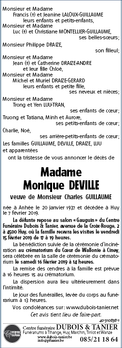 Fallecida en Huy (4500) el jueves, 7 de febrero de 2019 a la edad de 82 años