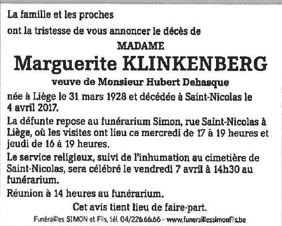 Décédée à Saint-Nicolas (Lg.) (4420) le mardi 4 avril 2017 à l'âge de 89 ans