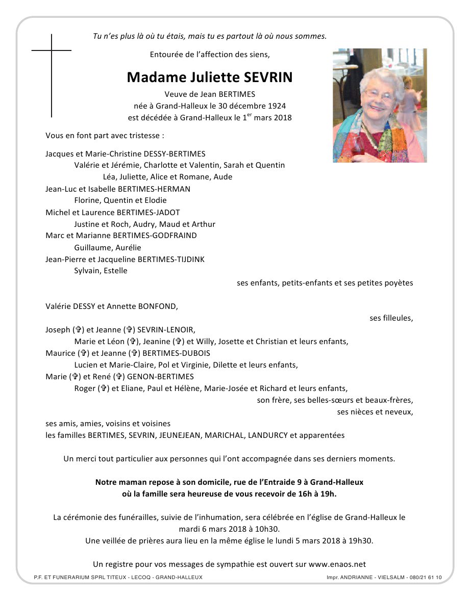 Décédée à Grand-Halleux (6698) le jeudi 1 mars 2018 à l'âge de 93 ans