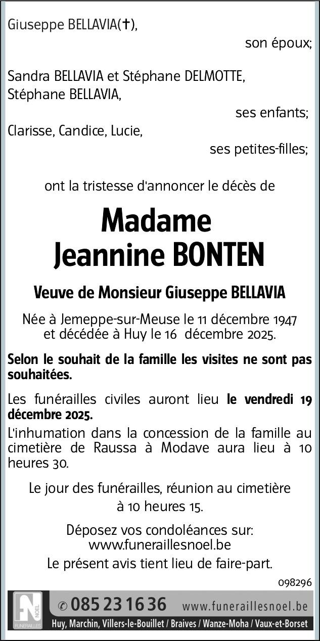 Décédée à Huy (4500) le mardi 16 décembre 2025 à l'âge de 78 ans