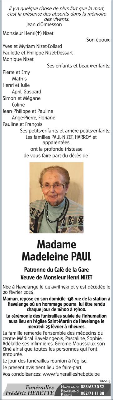 Décédée à Havelange (5370) le vendredi 20 février 2026 à l'âge de 94 ans