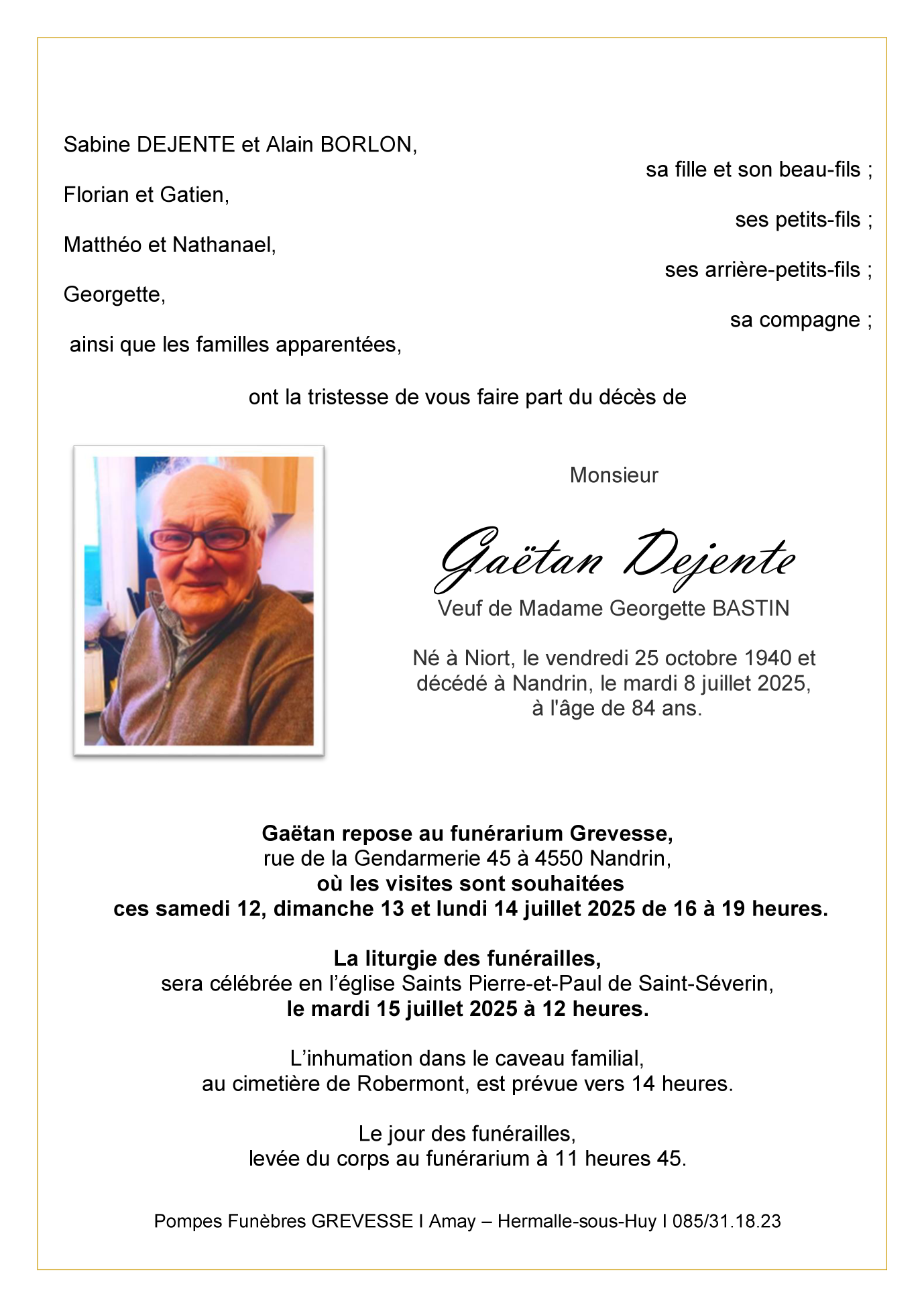Died in Nandrin (4550) on 08 July 2025 at the age of 84 years