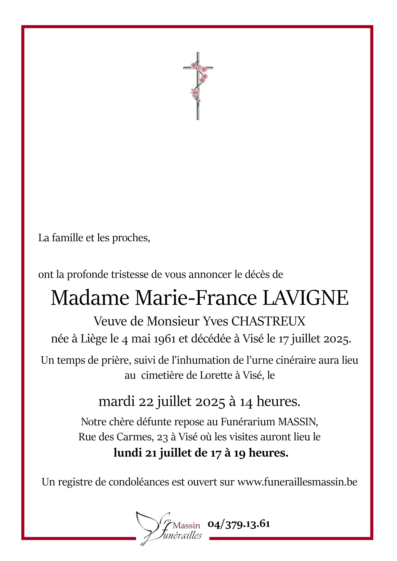 Décédée à Visé (4600) le jeudi 17 juillet 2025 à l'âge de 64 ans