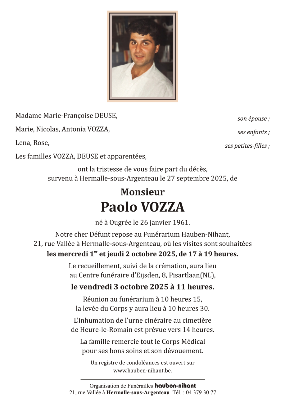 Décédé à Hermalle-sous-Argenteau (4681) le samedi 27 septembre 2025 à l'âge de 64 ans