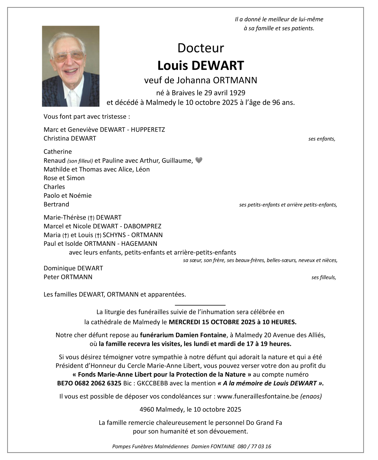 Décédé à Malmedy (4960) le vendredi 10 octobre 2025 à l'âge de 96 ans