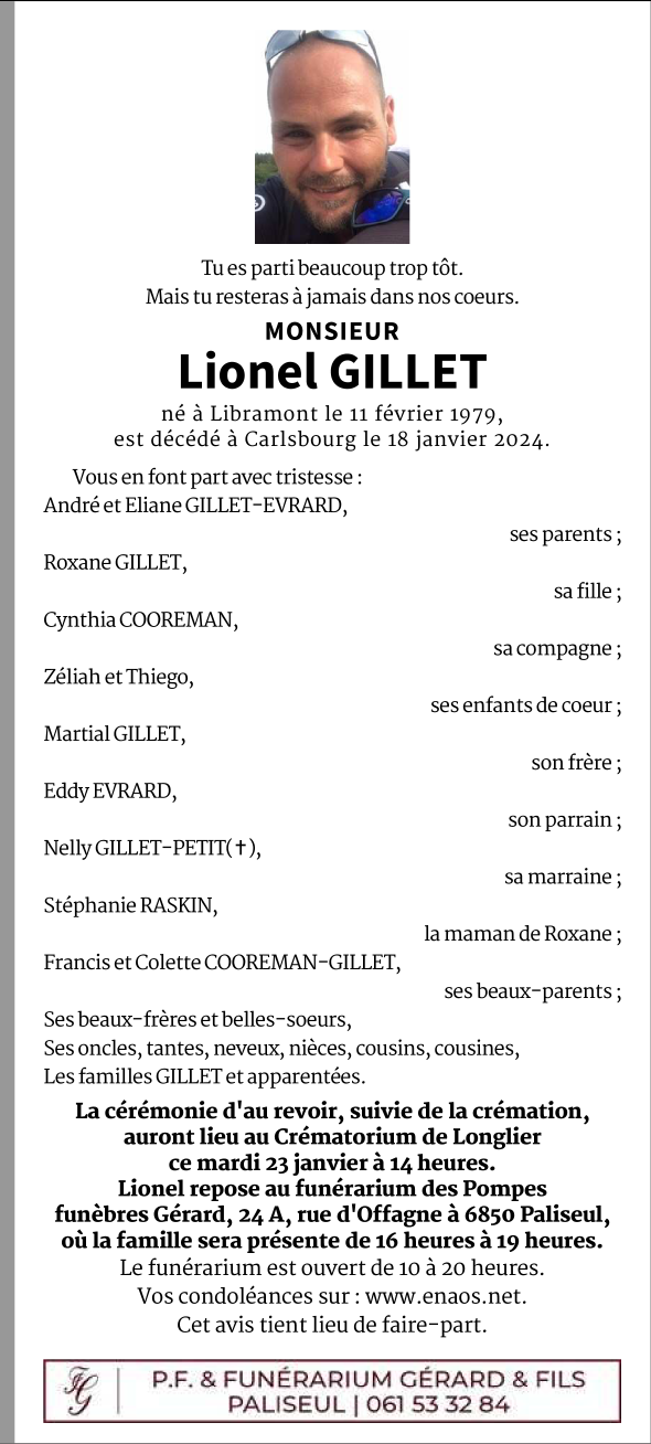 Fallecido en Carlsbourg (6850) el viernes, 19 de enero de 2024 a la edad de 44 años