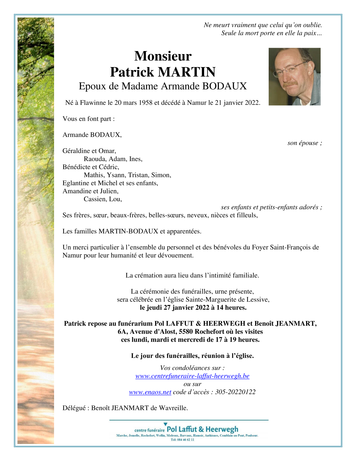 Décédé à Namur (5000) le vendredi 21 janvier 2022 à l'âge de 63 ans