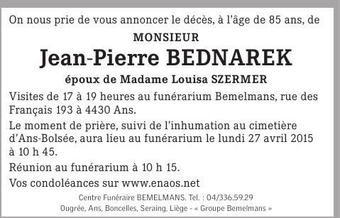 Décédé à Ans (4430) le mercredi 22 avril 2015 à l'âge de 85 ans