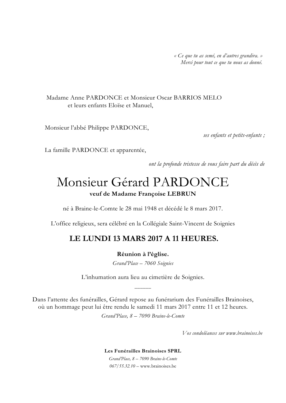Died in Braine-le-Comte (7090) on 08 March 2017 at the age of 68 years
