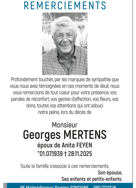 Décédé à Verviers (4800) le vendredi 28 novembre 2025 à l'âge de 86 ans