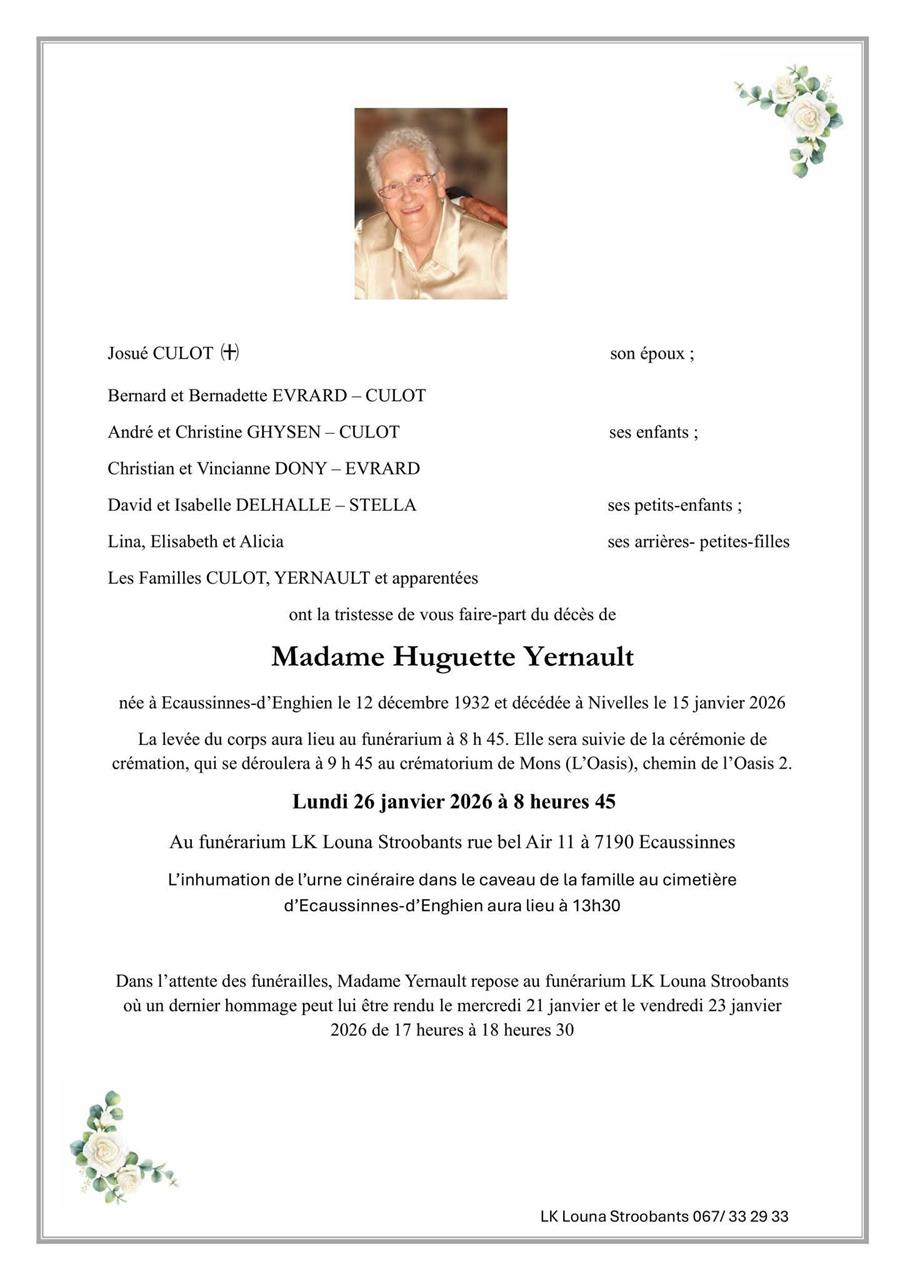 Décédée à Nivelles (1400) le jeudi 15 janvier 2026 à l'âge de 94 ans
