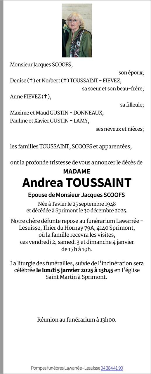 Décédée à Sprimont (4140) le mercredi 31 décembre 2025 à l'âge de 77 ans