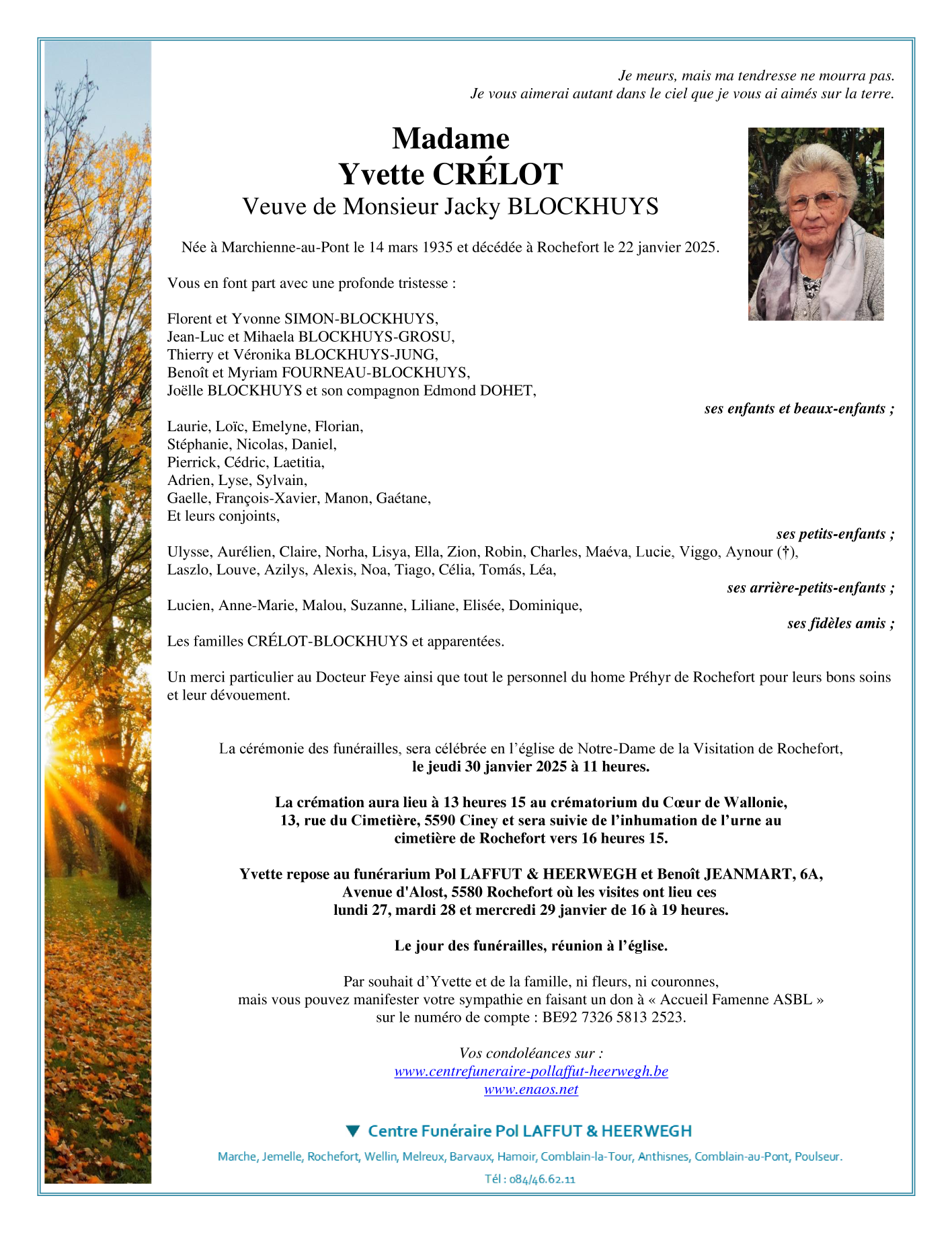 Overleden te Rochefort (5580) op woensdag 22 januari 2025 op 89-jarige leeftijd