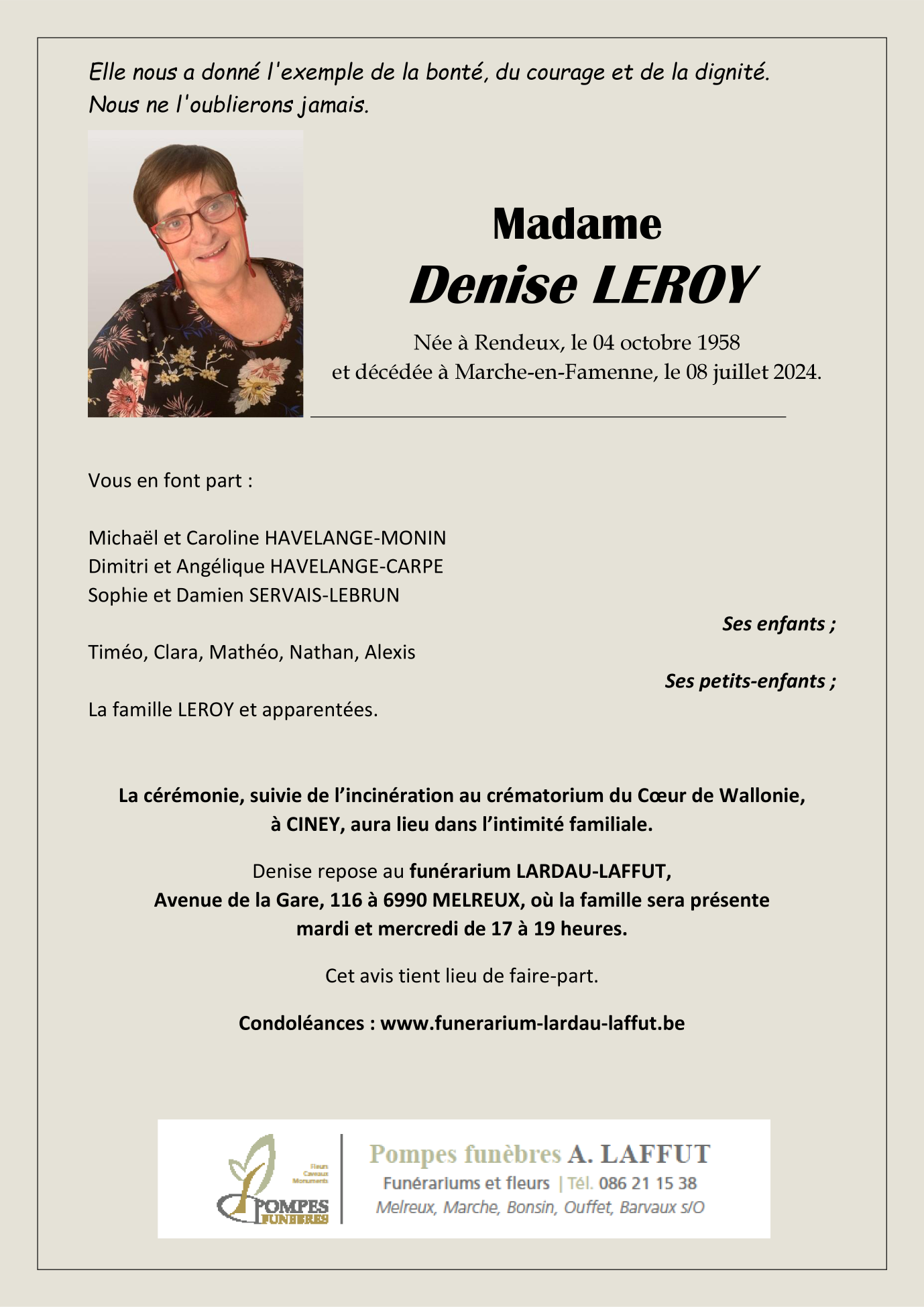 Décédée à Marche-en-Famenne (6900) le lundi 8 juillet 2024 à l'âge de 65 ans