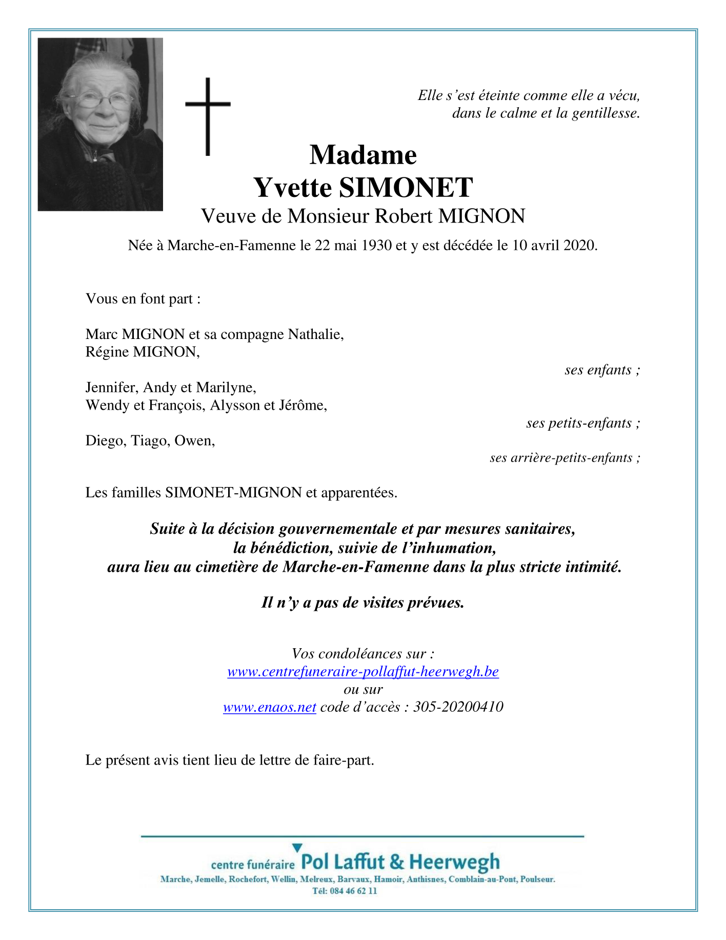 Décédée à Marche-en-Famenne (6900) le vendredi 10 avril 2020 à l'âge de 89 ans