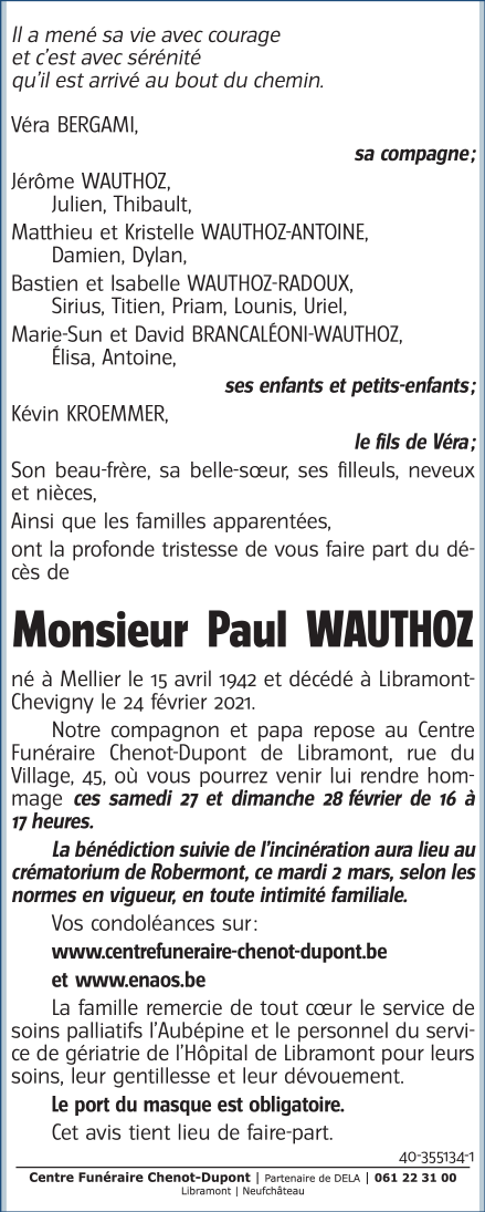 Décédé à Libramont (6800) le mercredi 24 février 2021 à l'âge de 78 ans