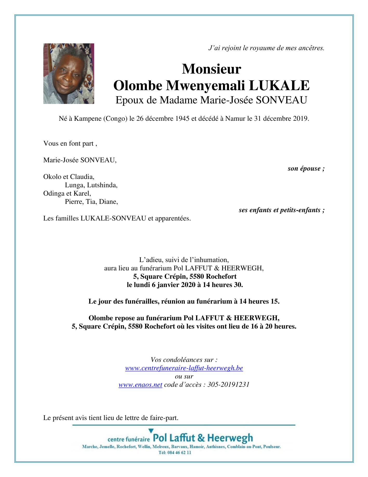 Décédé à Namur (5000) le mardi 31 décembre 2019 à l'âge de 74 ans