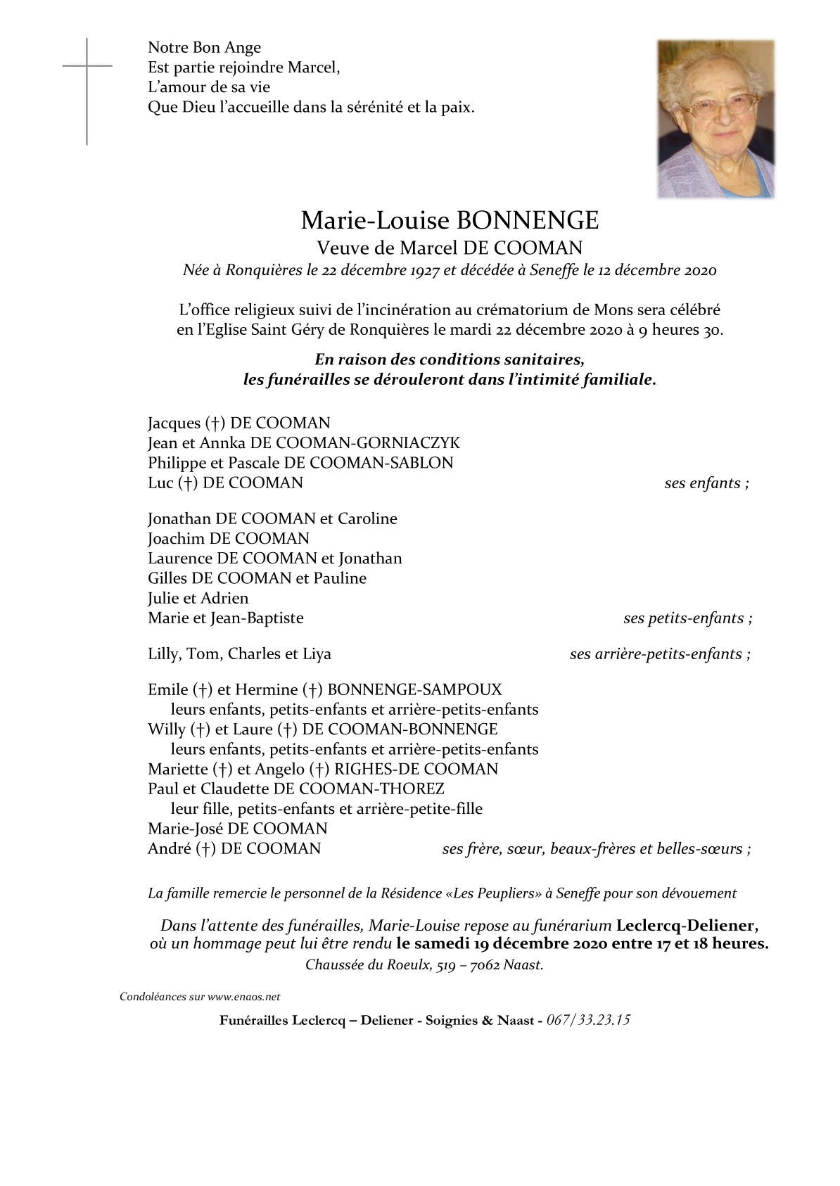 Décédée à Seneffe (7180) le samedi 12 décembre 2020 à l'âge de 92 ans