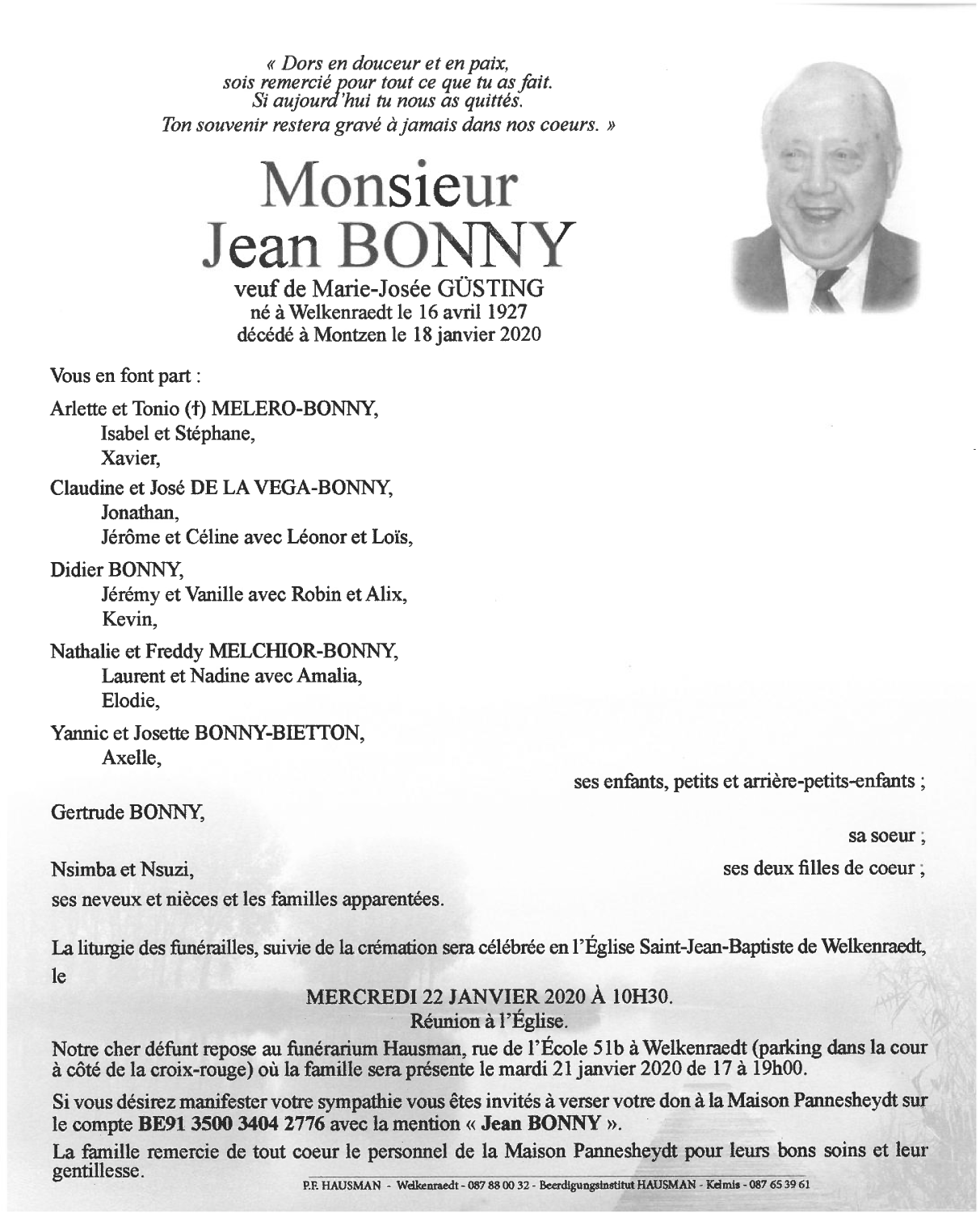 Overleden te Montzen (4850) op zaterdag 18 januari 2020 op 92-jarige leeftijd