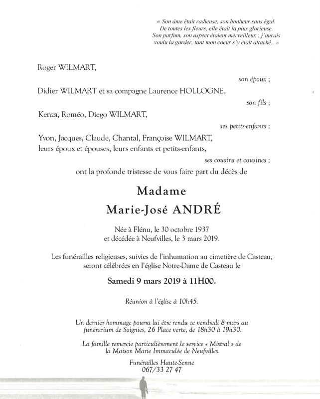 Décédée à Neufvilles (7063) le dimanche 3 mars 2019 à l'âge de 81 ans