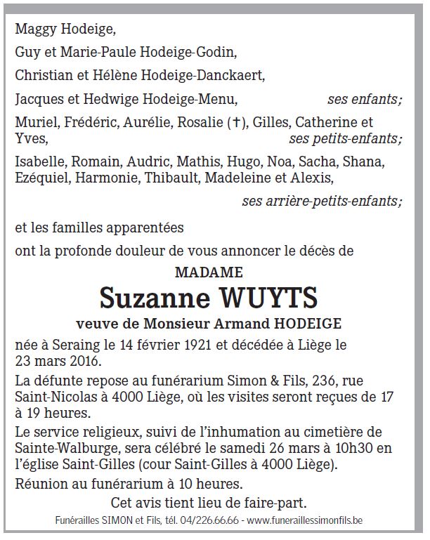 Died in Liège (4000) on 23 March 2016 at the age of 95 years