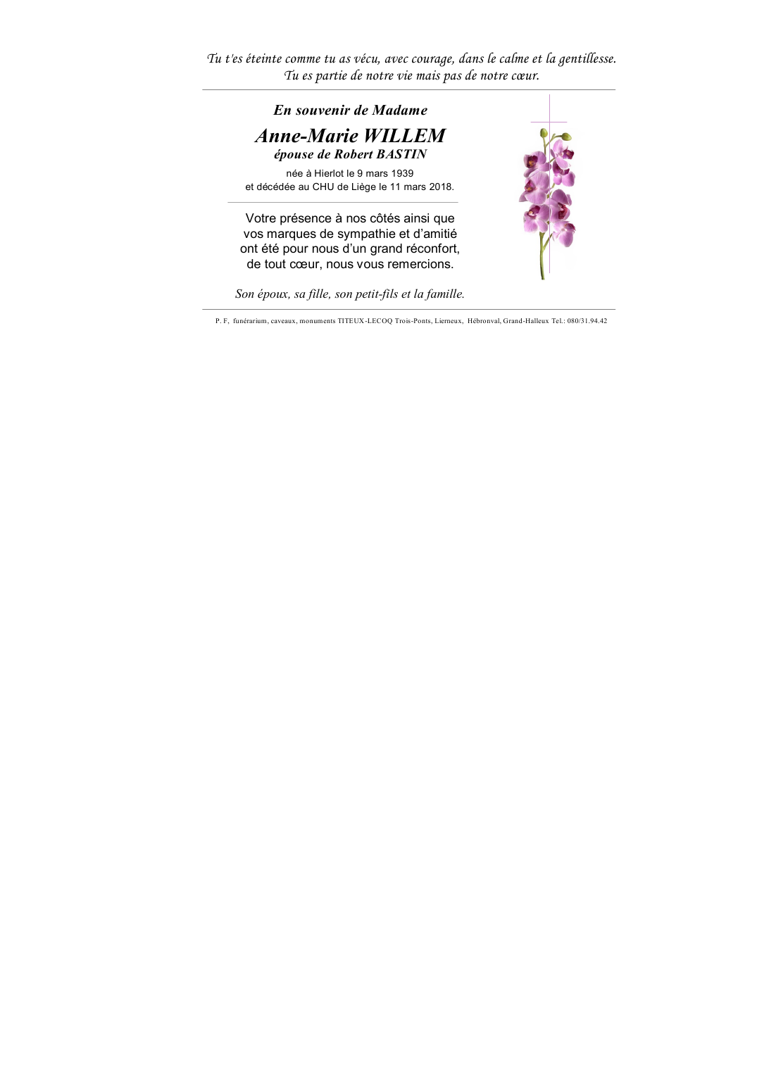 Fallecida en Liège (4000) el domingo, 11 de marzo de 2018 a la edad de 79 años