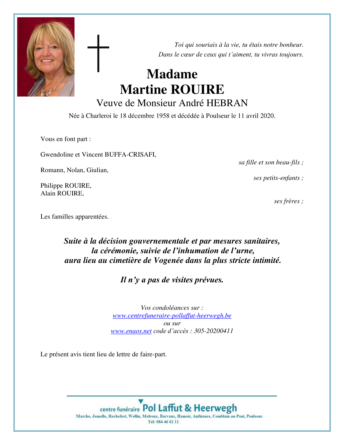 Décédée à Poulseur (4171) le samedi 11 avril 2020 à l'âge de 61 ans