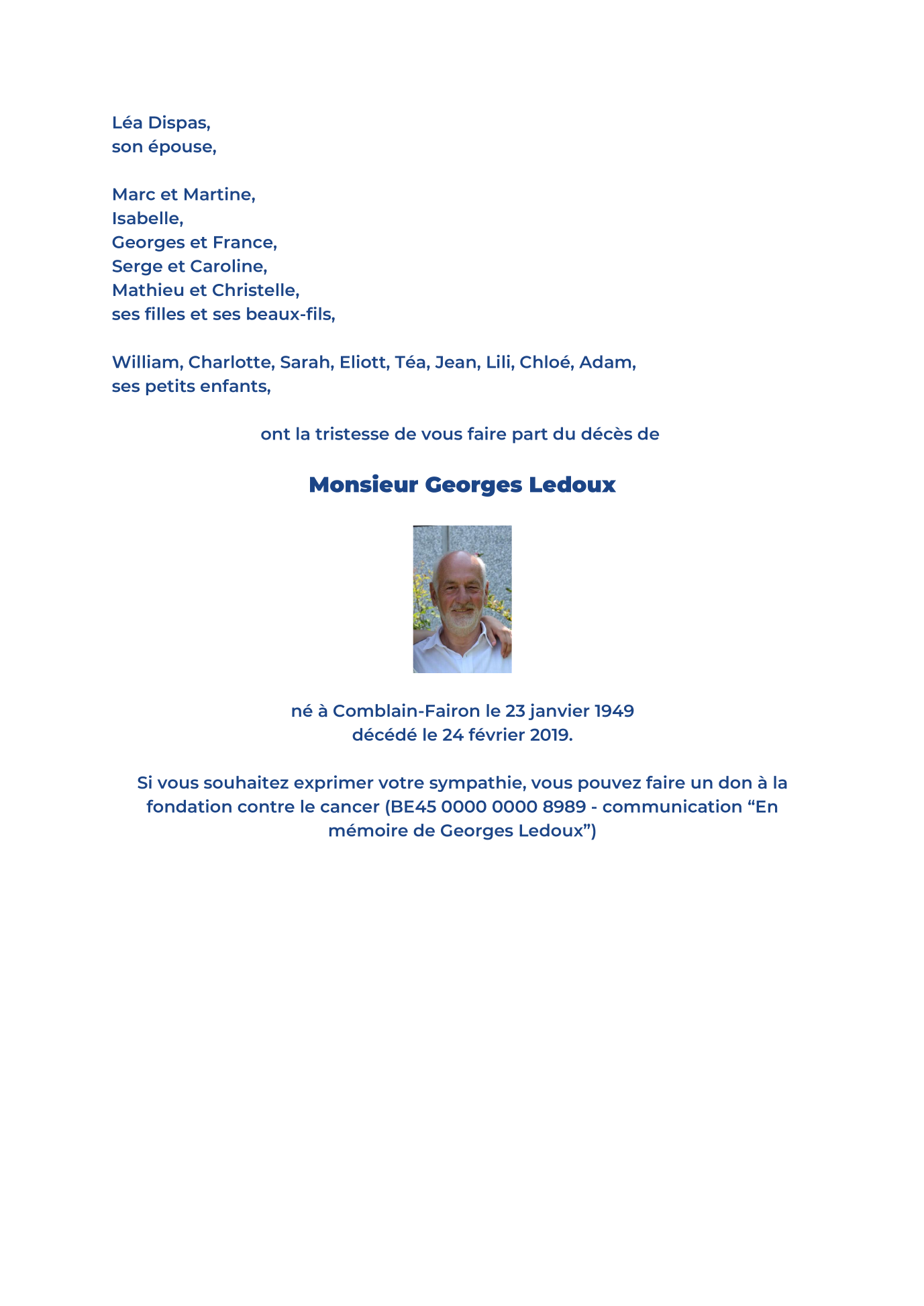 Died in Sart-Tilman (4031) on 24 February 2019 at the age of 70 years