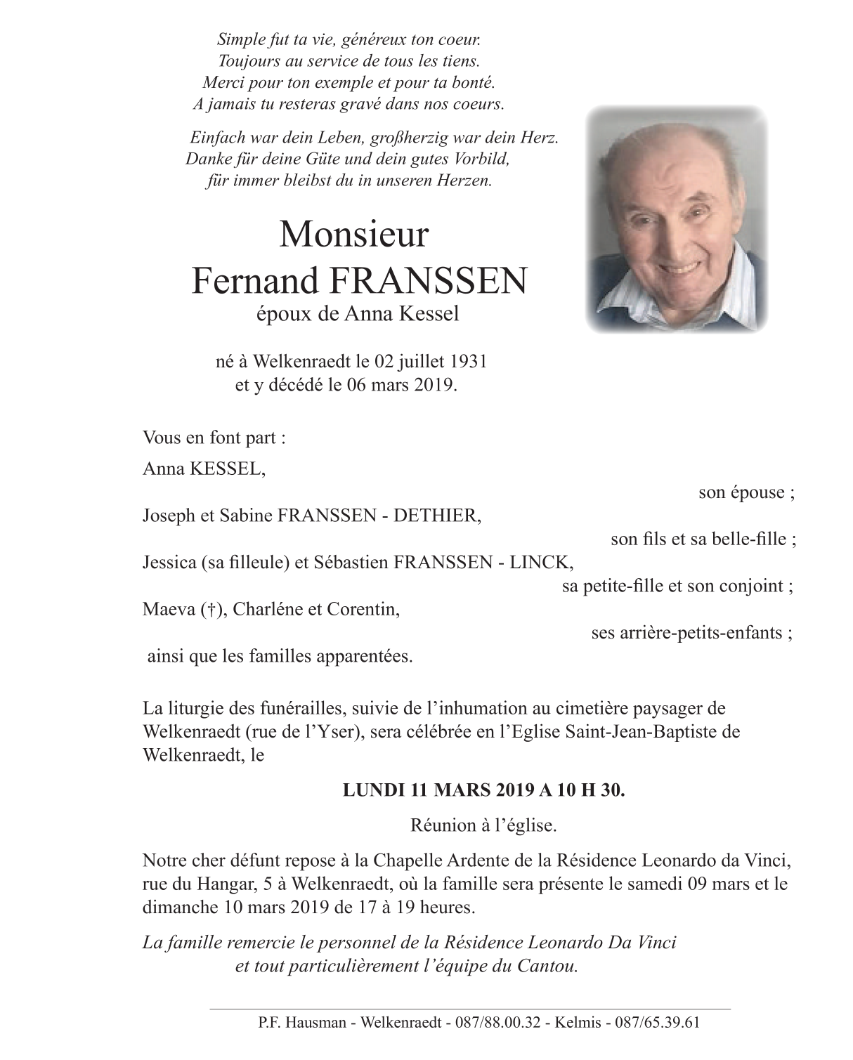 Fallecido en Welkenraedt (4840) el miércoles, 6 de marzo de 2019 a la edad de 87 años