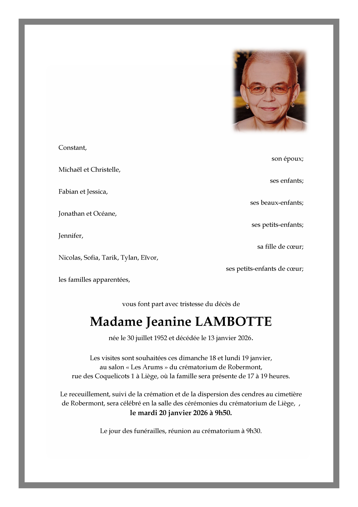 Fallecida en Chênée (4032) el martes, 13 de enero de 2026 a la edad de 73 años
