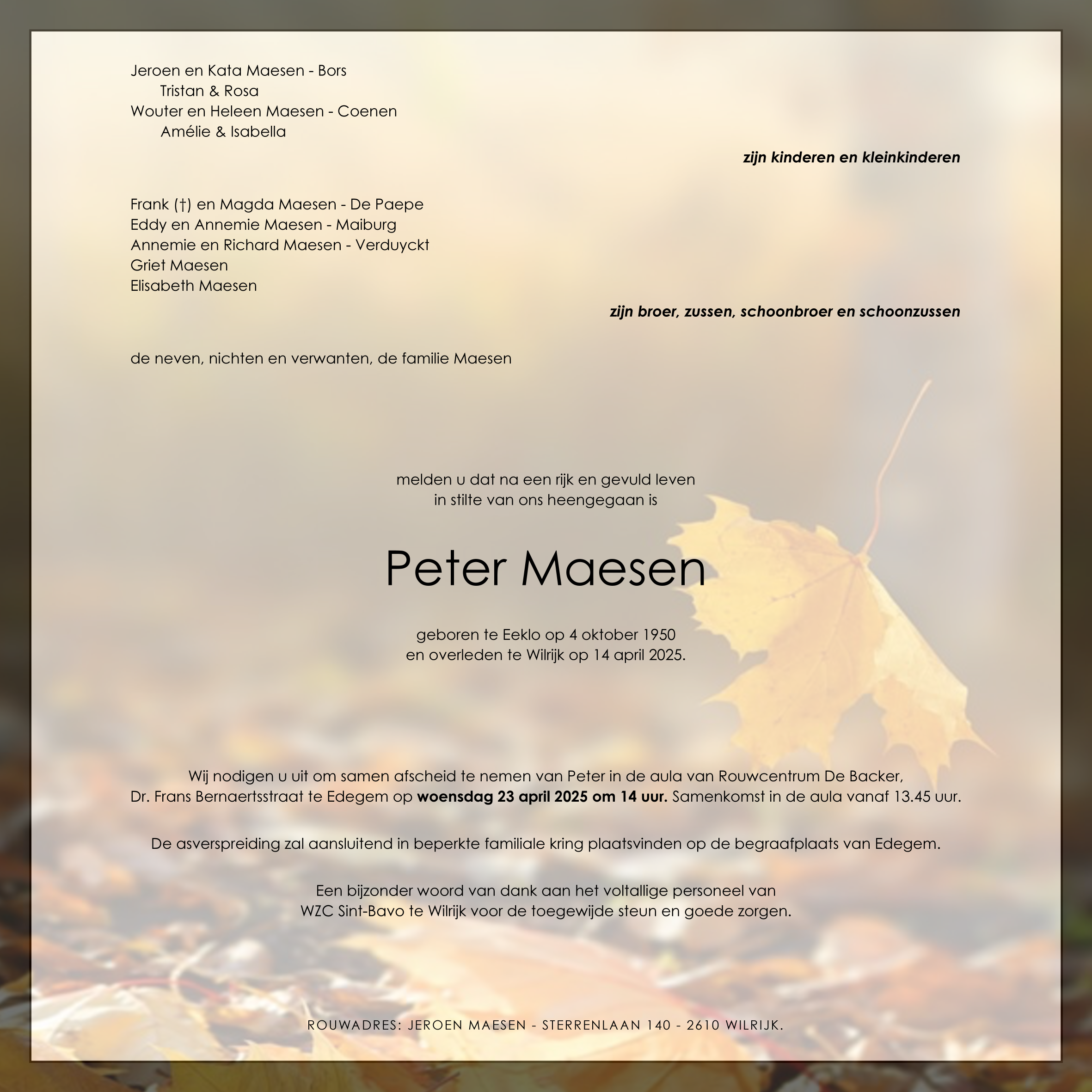 Fallecido en Wilrijk (Antwerpen) (2610) el lunes, 14 de abril de 2025 a la edad de 74 años