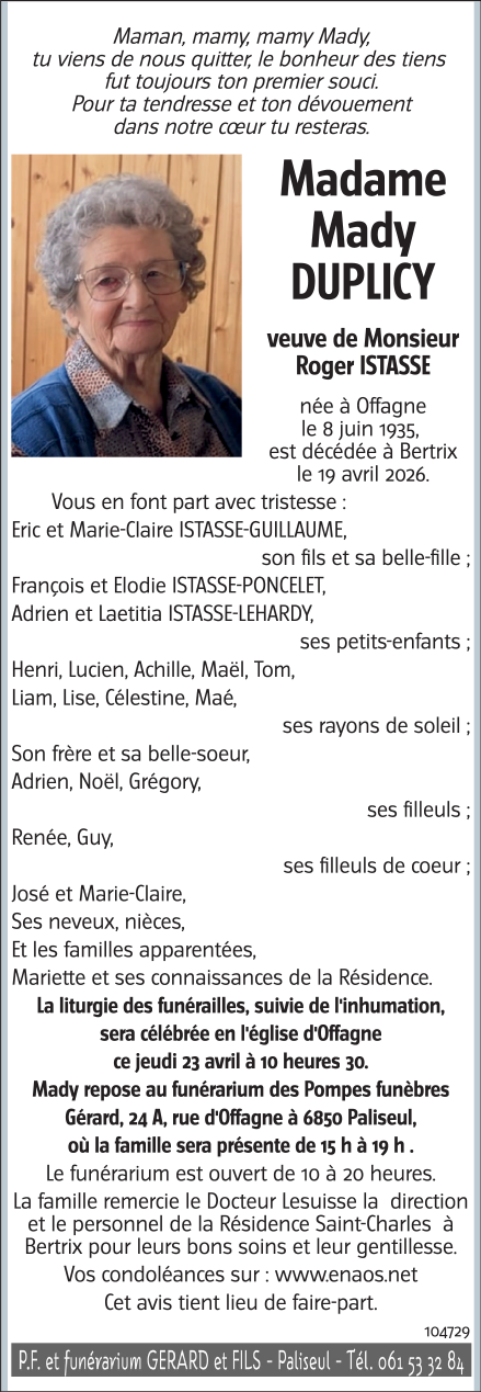 Décédée à Bertrix (6880) le dimanche 19 avril 2026 à l'âge de 90 ans