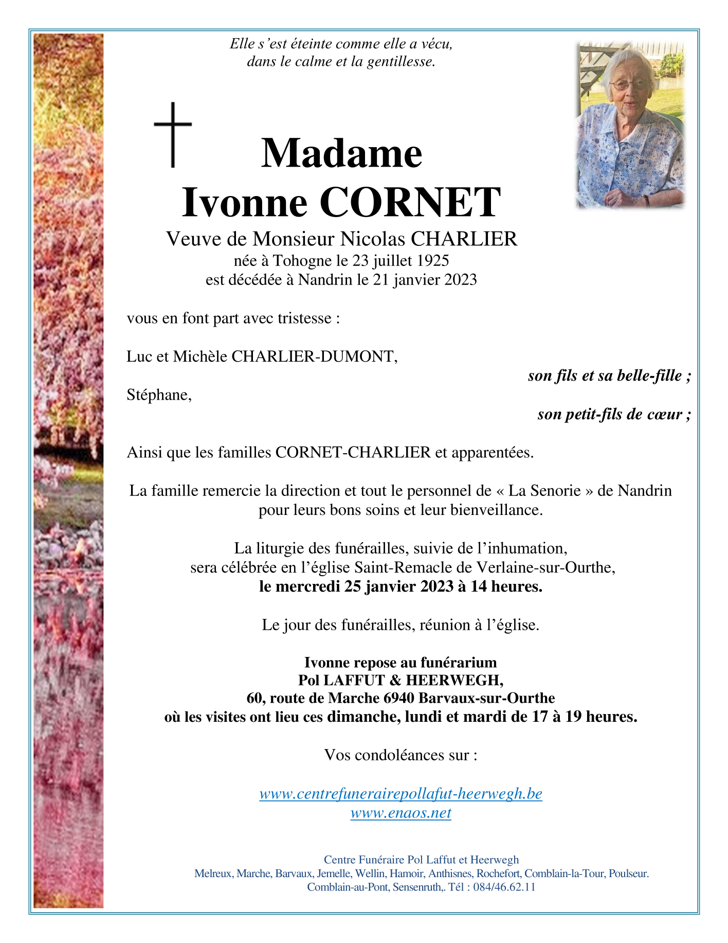 Fallecida en Nandrin (4550) el sábado, 21 de enero de 2023 a la edad de 97 años