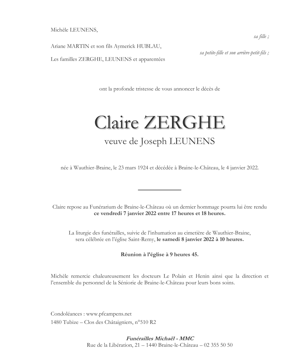Décédée à Braine-le-Château (1440) le mardi 4 janvier 2022 à l'âge de 97 ans