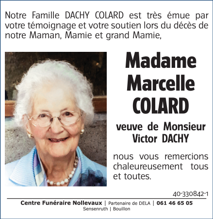 Décédée à Bouillon (6830) le lundi 23 décembre 2019 à l'âge de 94 ans